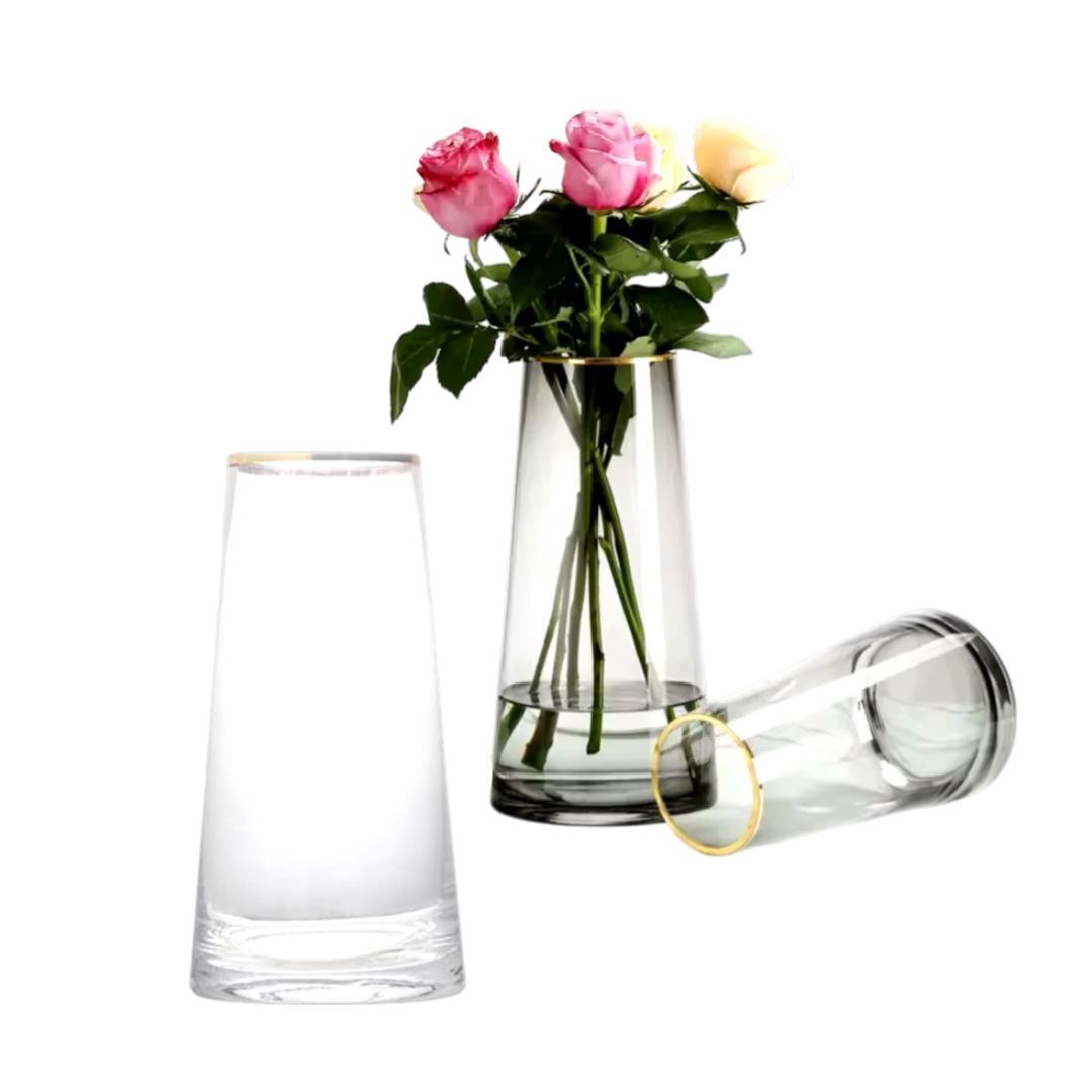 Florero de vidrio conico borde dorado