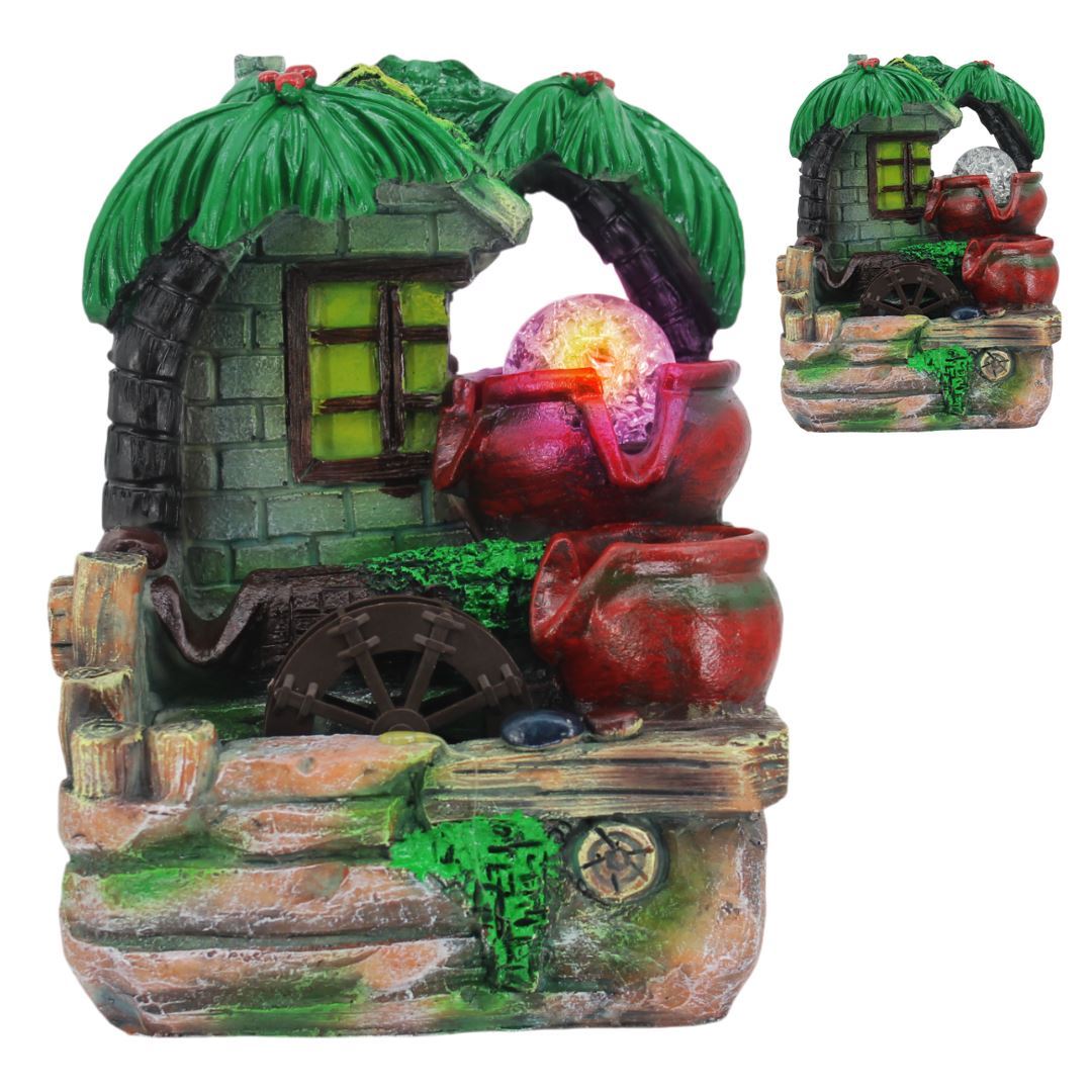 Fuente de agua cabaña palmeras con bola cristal con luz