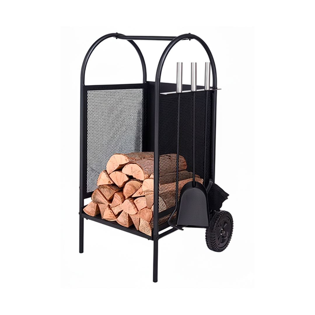 Carro Leñero metálico con ruedas + Set atizador pala cepillo