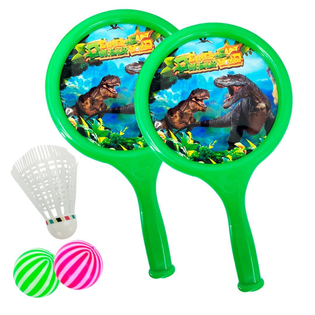 Raquetas dinosaurio con 2 pelotas en red-27X22cm.